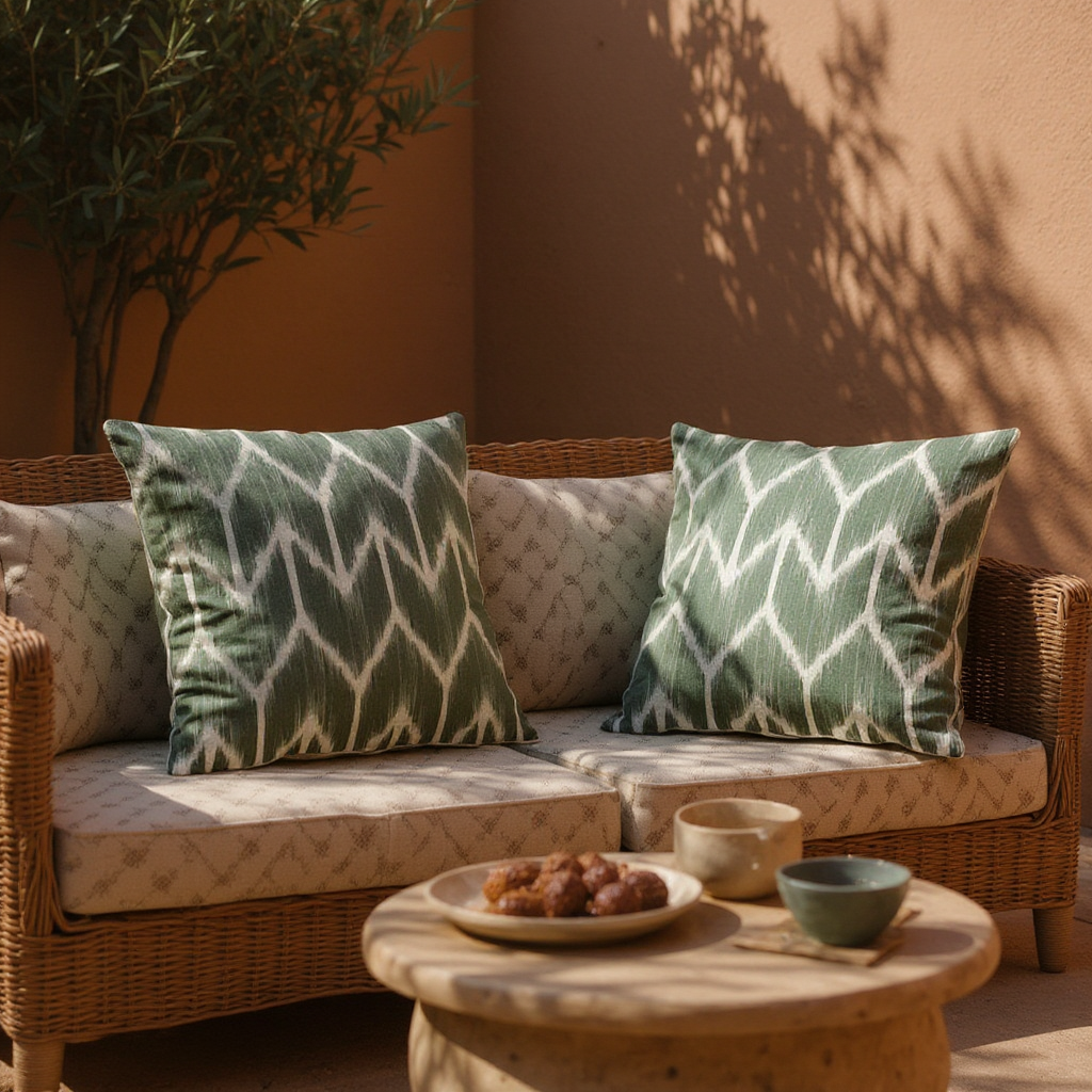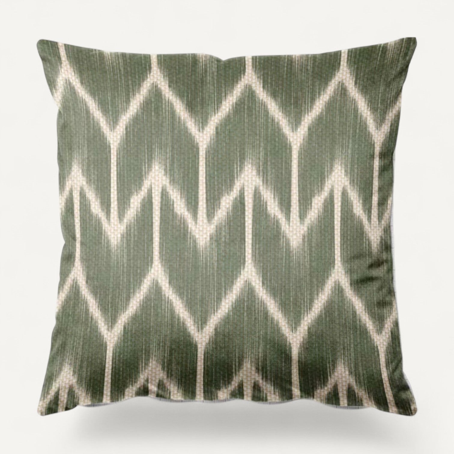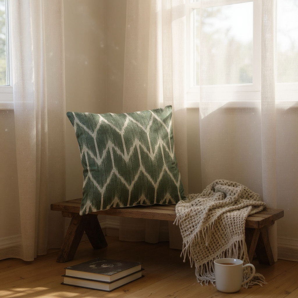 The Ikat Arrowhead Cushion combines crafted geometry with subtle softness. Its arrow-shaped zigzags blur at the edges in true ikat style, giving the pattern both movement and depth. A bold yet versatile accent, it adds a touch of artisanal character to sofas, chairs, or beds.