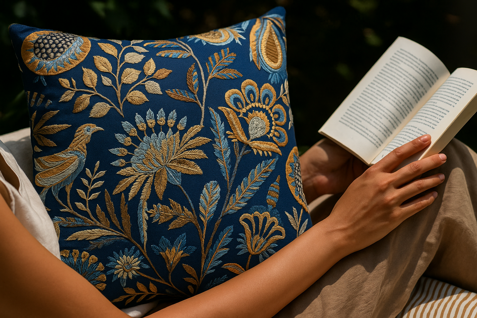 A lyrical blend of texture and detail, Autumn Song features intricate botanical embroidery inspired by the quiet beauty of changing seasons. Autumn Song brings warmth and grace to cushions, sofas, drapery, and more. Its gentle motifs offer an artisanal finish suited for serene yet luxurious spaces.