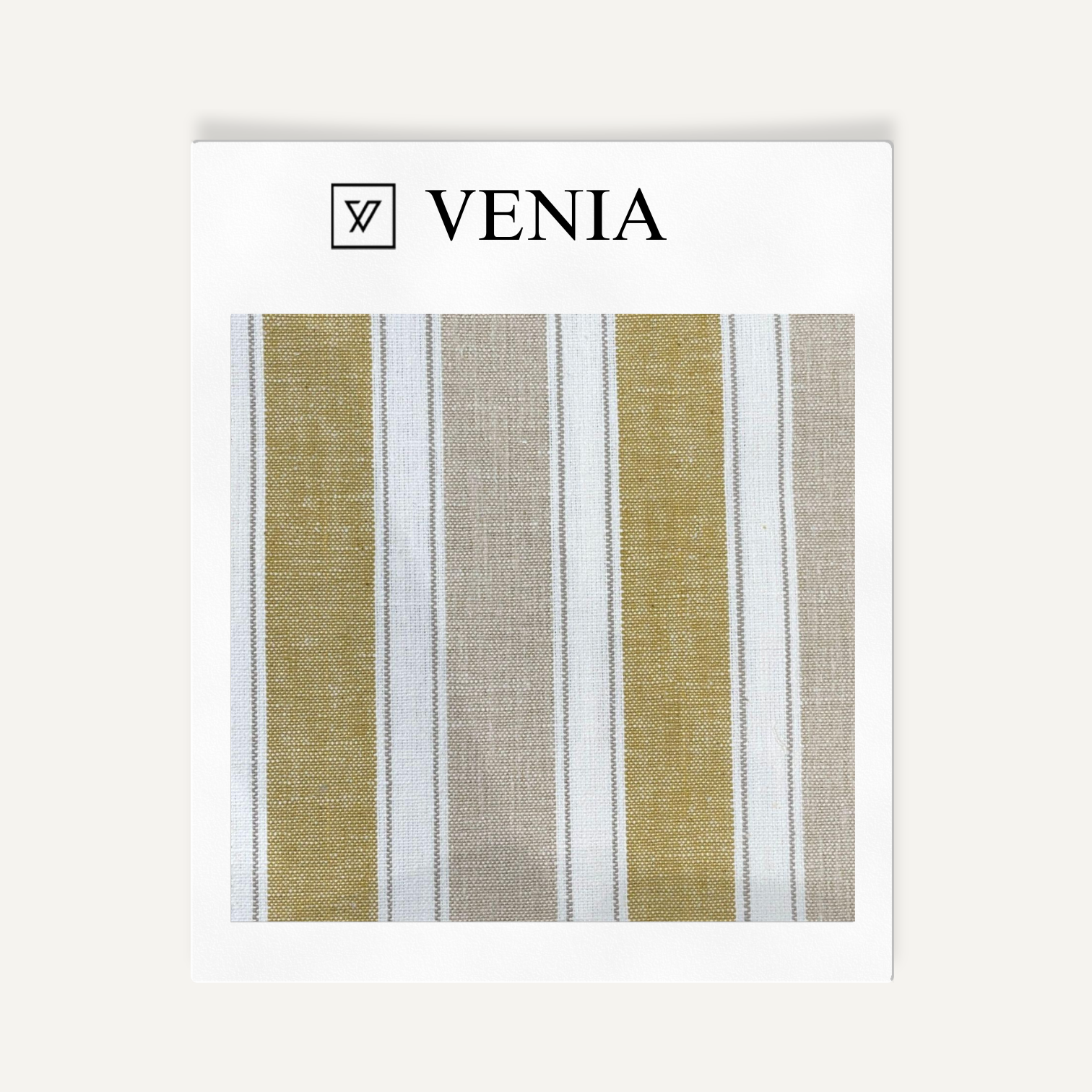 Venia's Bold Stripe Fabric features wide stripes in muted shades of yellow, and grey beige. This high-impact pattern brings confident structure and vintage charm to any space. Ideal for statement cushions, upholstery, or blinds/ curtains that need presence.