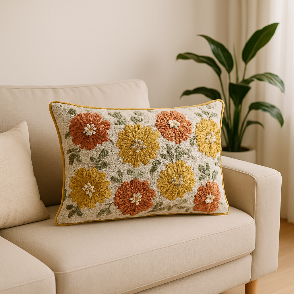 Immerse yourself in the charm of our Bushra cushion, adorned with delicate threadwork in beautiful hues. Style it on a neutral-toned sofa and mix with other floral patterns for a fresh and upbeat look.