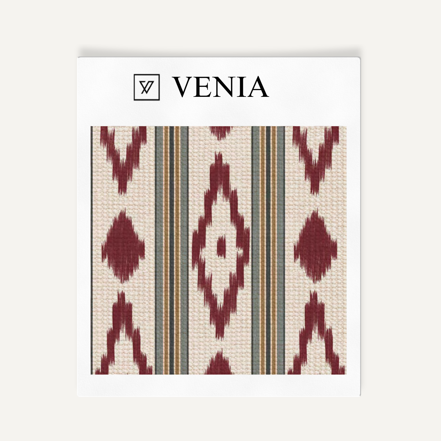 Caravan Trail is an ikat-inspired stripe fabric with elongated diamond motifs and rhythmic vertical lines. Its bold yet versatile design makes it a standout choice for upholstery, curtains, and cushions. Woven in a durable cotton-blend, this fabric balances heritage craft with a modern look, ideal for creating statement chairs, accent cushions, or stylish drapery.