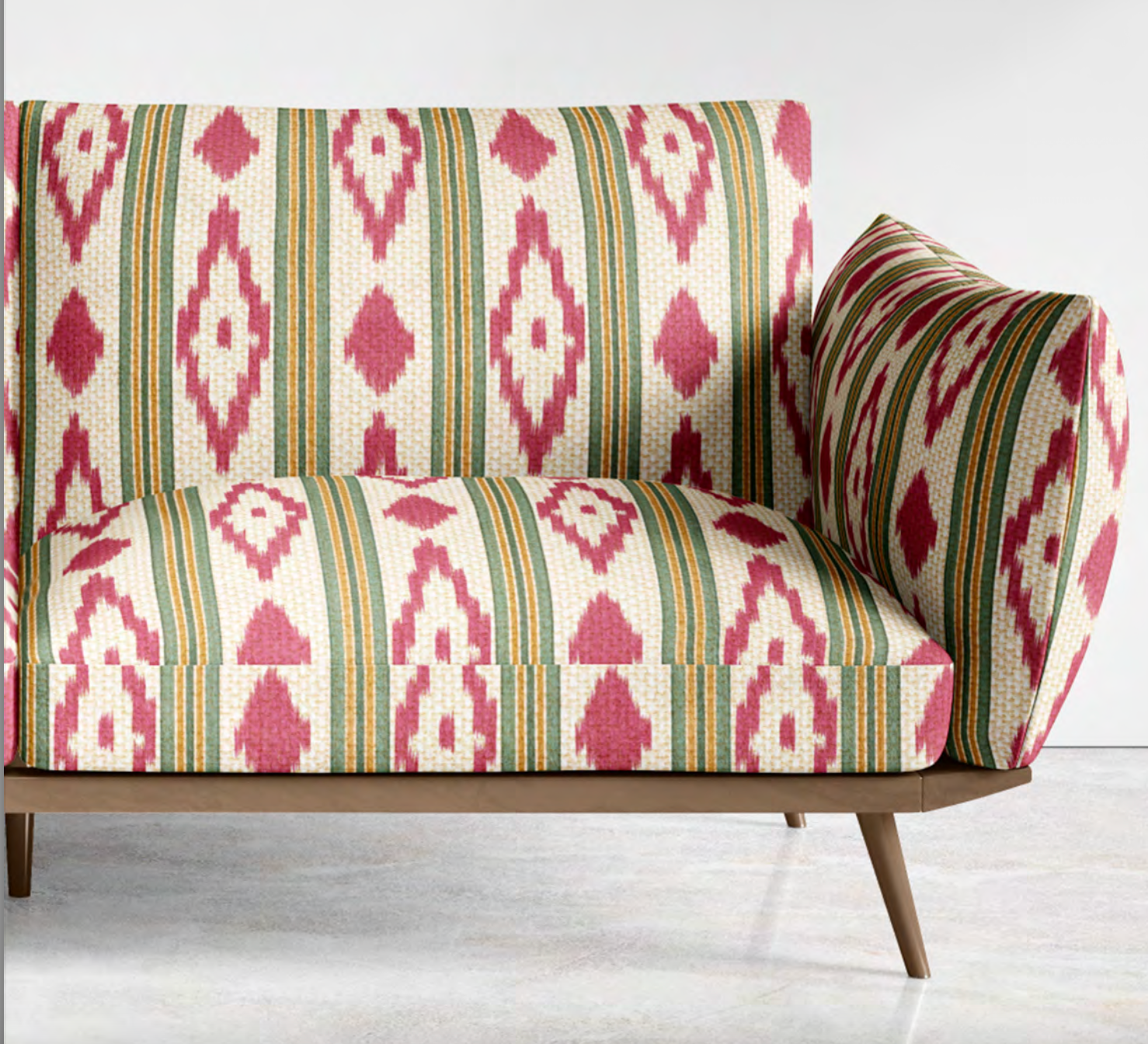 Caravan Trail is an ikat-inspired stripe fabric with elongated diamond motifs and rhythmic vertical lines. Its bold yet versatile design makes it a standout choice for upholstery, curtains, and cushions. Woven in a durable cotton-blend, this fabric balances heritage craft with a modern look, ideal for creating statement chairs, accent cushions, or stylish drapery.
