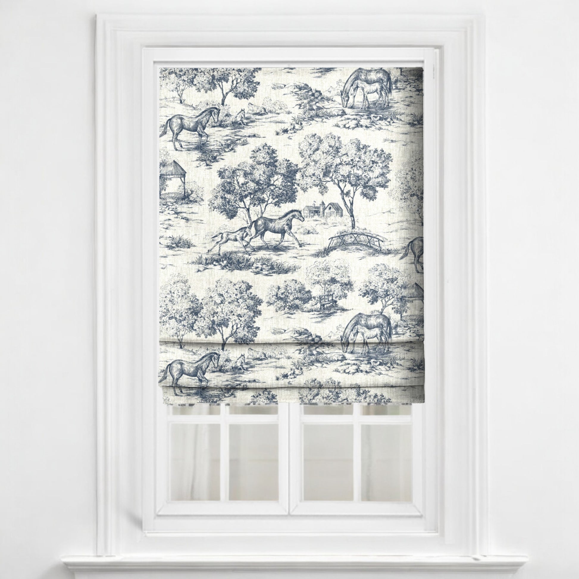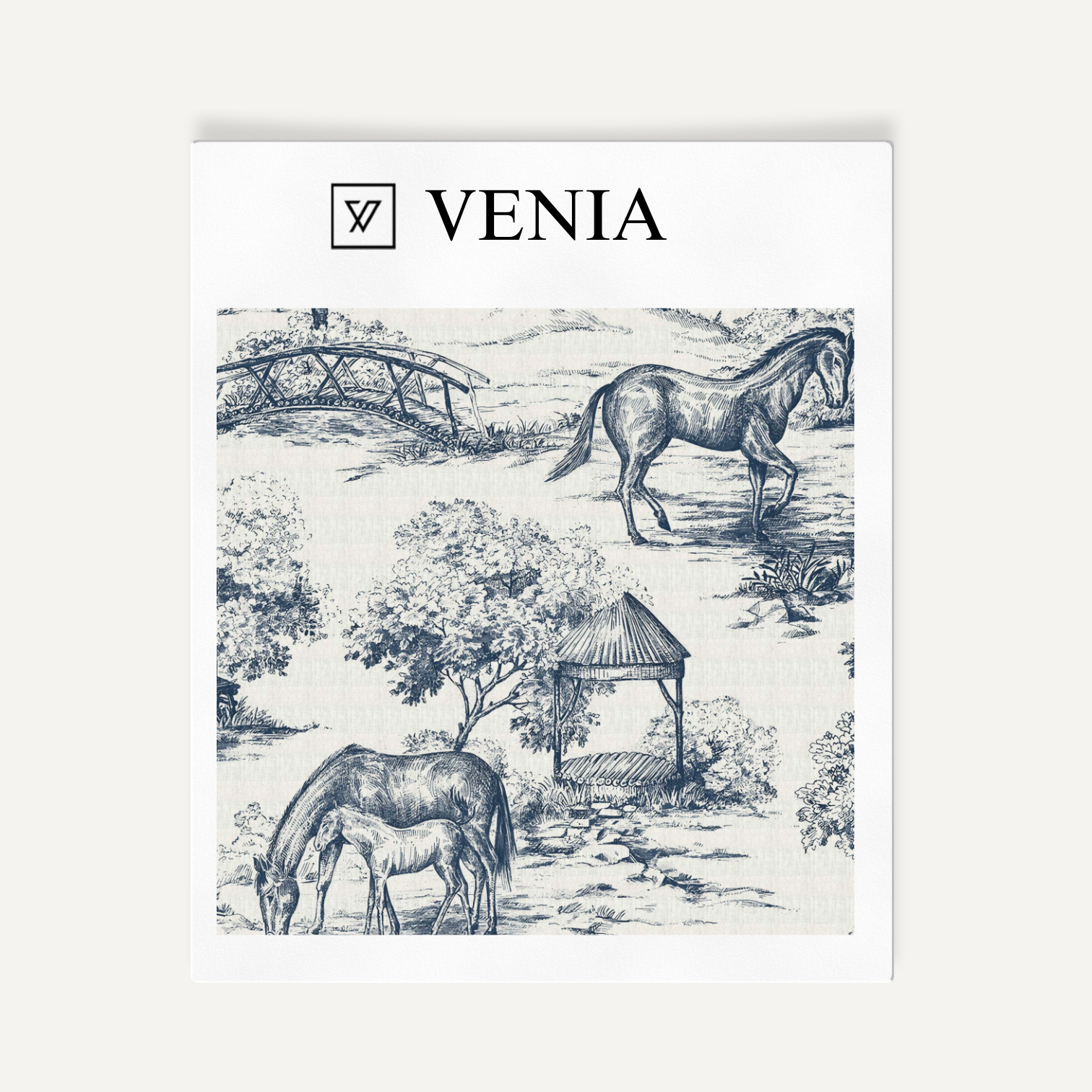 This vintage-inspired toile fabric showcases graceful horses roaming idyllic pastoral landscapes, framed by lush trees, rustic gazebos, and quaint cottages. A nod to European equestrian heritage, its intricate detailing and classic color palette make it a perfect choice for curtains, upholstery, and statement pieces.