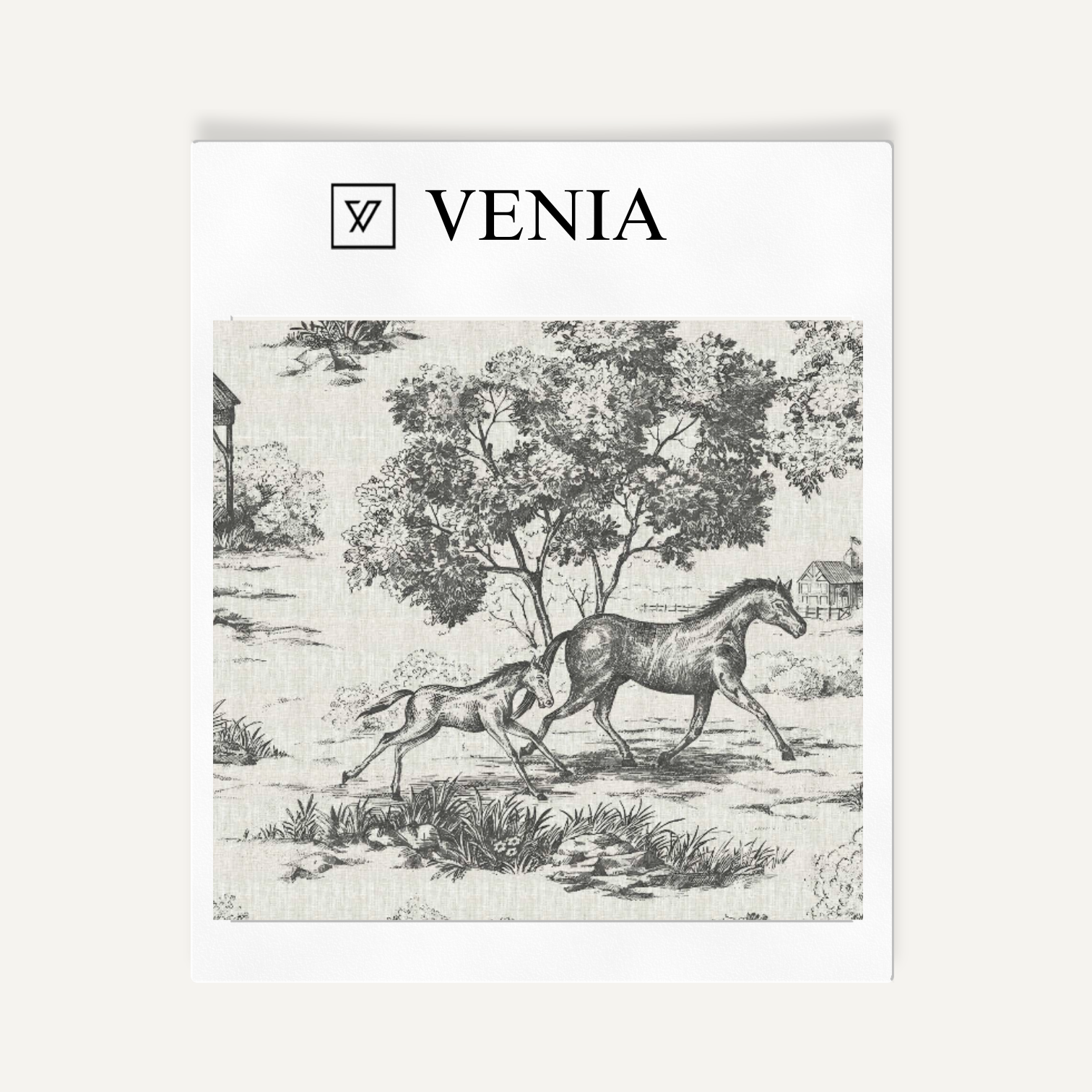 This vintage-inspired toile fabric showcases graceful horses roaming idyllic pastoral landscapes, framed by lush trees, rustic gazebos, and quaint cottages. A nod to European equestrian heritage, its intricate detailing and classic color palette make it a perfect choice for curtains, upholstery, and statement pieces.