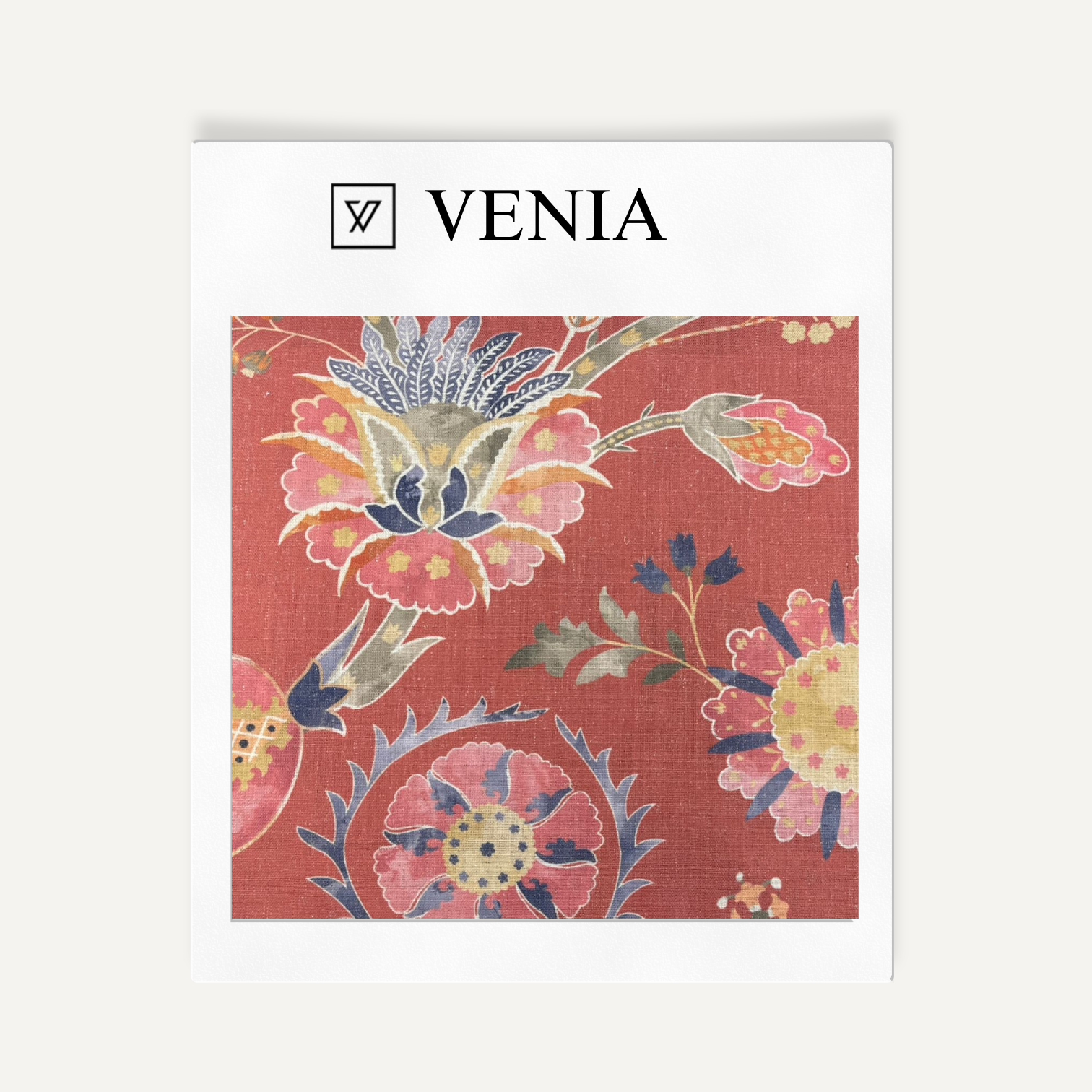 Crimson Jacobean reinterprets classic Jacobean florals in a bold red palette. A striking choice for heritage-inspired upholstery and drapery.