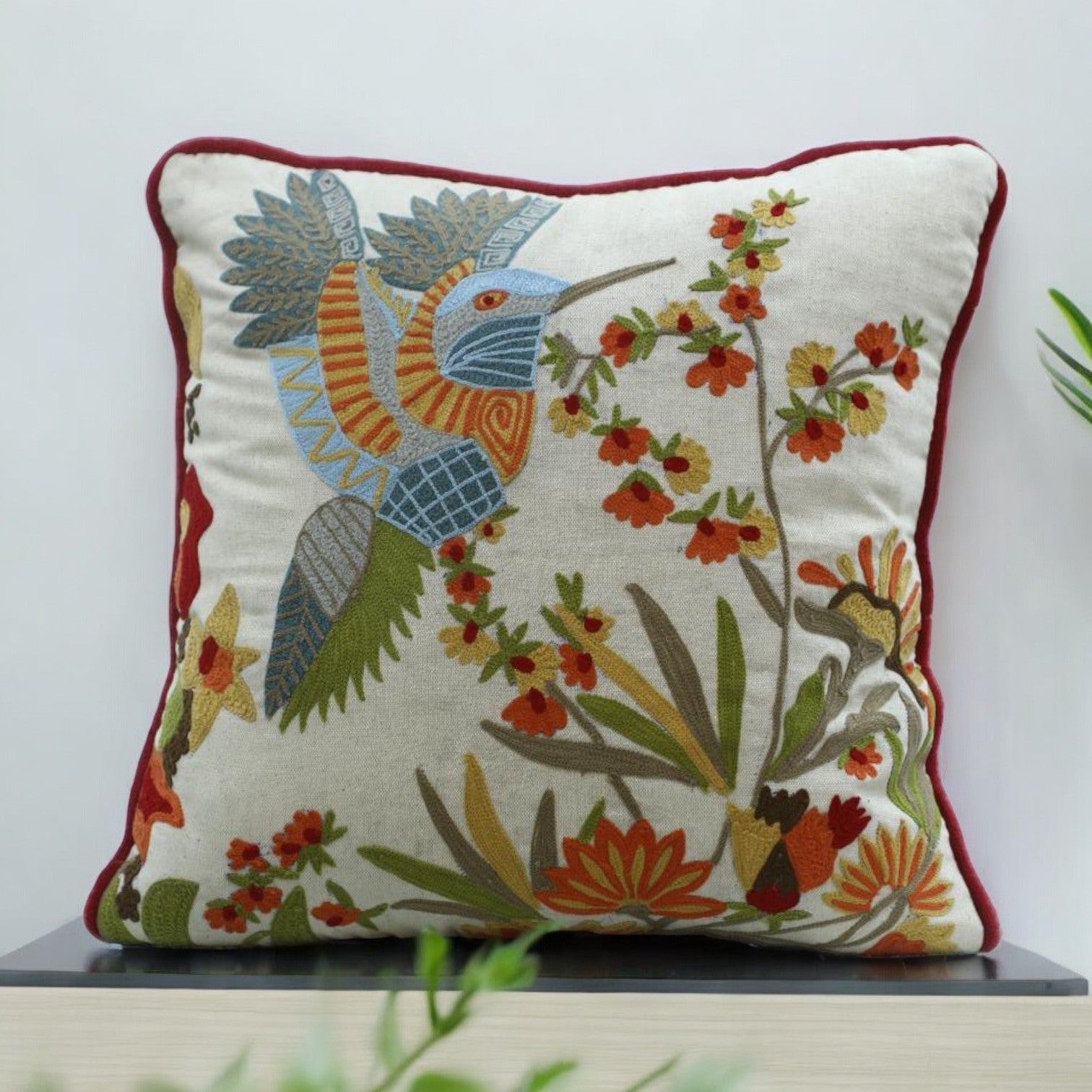 Embrace the serenity of dawn with our exquisite Fajr cushion cover, adorned with multi colored intricate embroidery of delicate flora and fauna on a white backdrop. Crafted for luxury and warmth, its premium design brings a touch of elegance to any setting, making it a perfect addition to your home decor.
