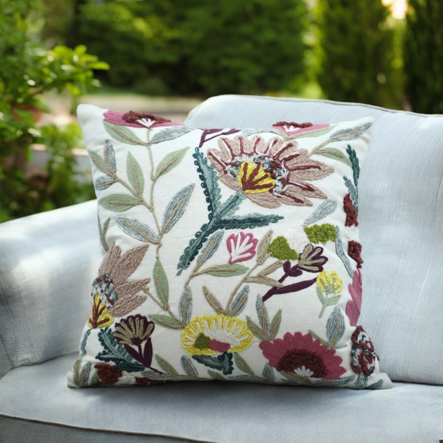 Discover our Farah cushion cover, inspired by 'delight'. Infuse joy into your space with our vibrant cushion cover. Featuring joyful thread work and floral patterns, it uplifts any room instantly, adding a touch of happiness to your home decor
