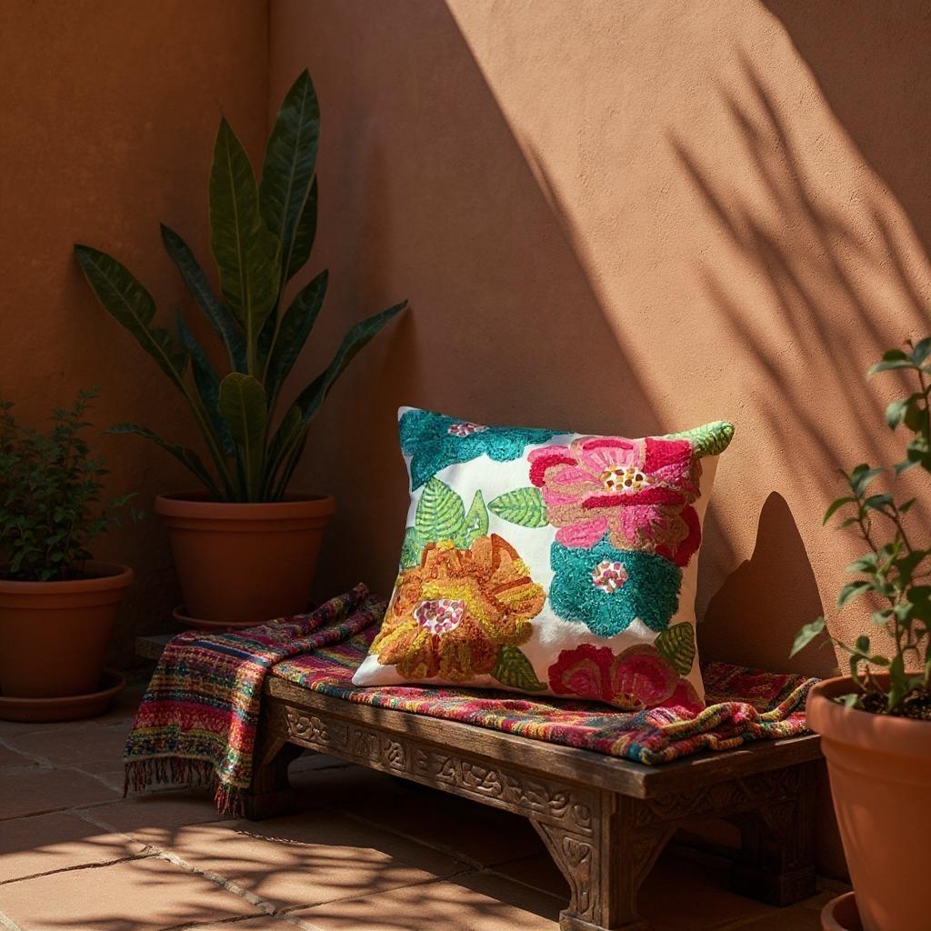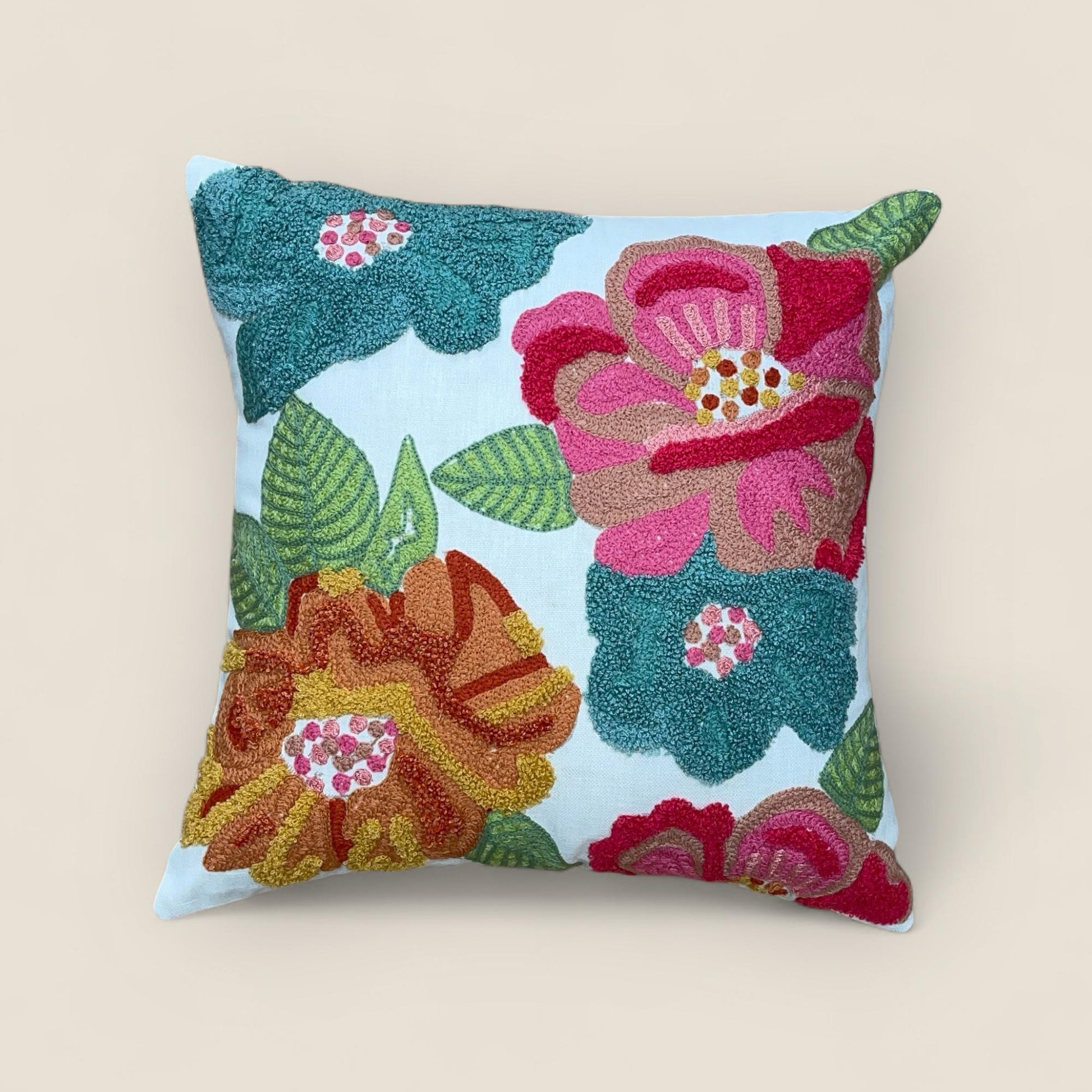Rooted in rustic charm, Field & Stitch brings together soft white cotton with bold, thread-embroidered florals in pink, yellow, and blue. The hand-finished look and 16x16 size make it a versatile accent — adding texture, colour, and a touch of countryside ease to any space.