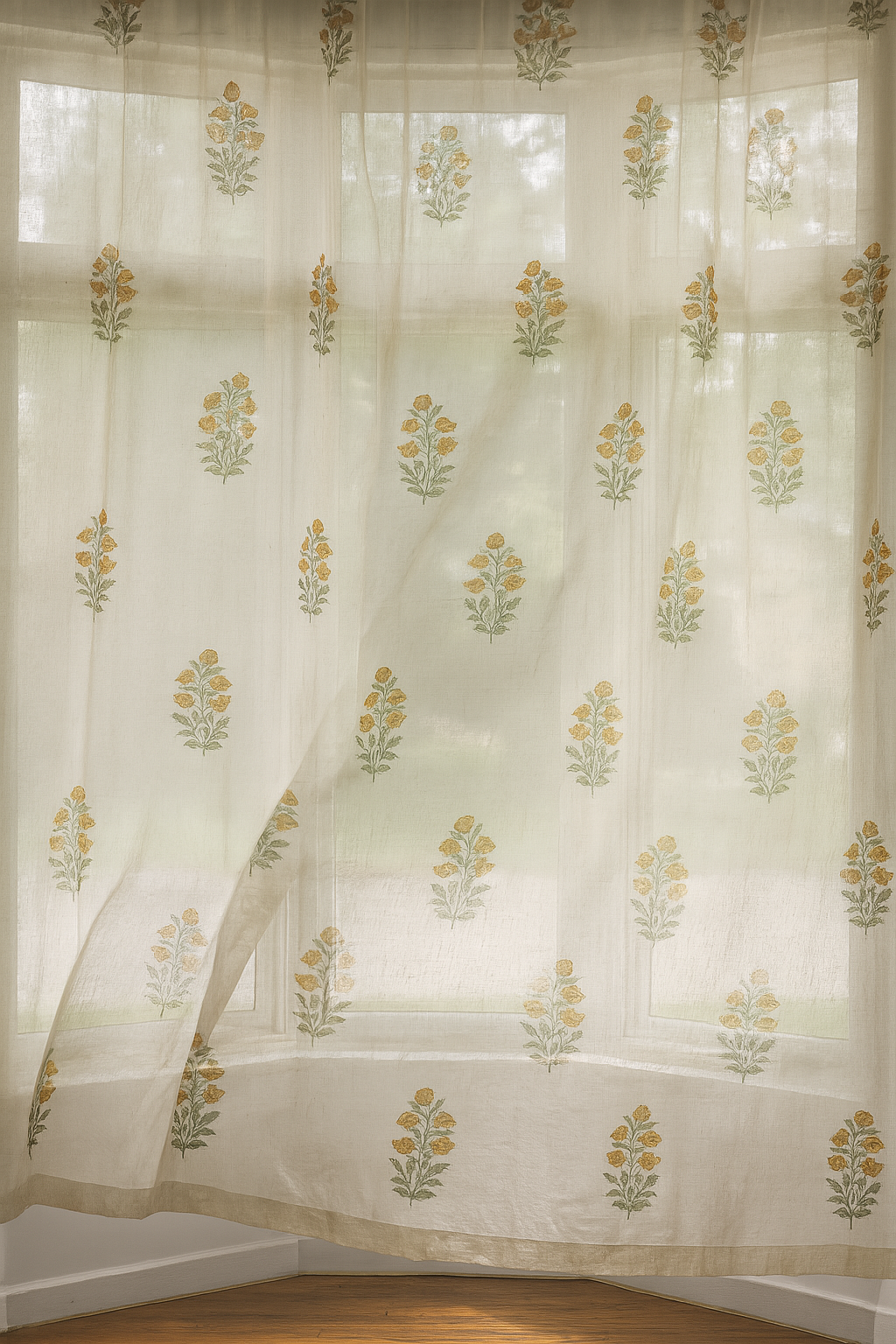 Subtle and serene, Floral Reverie adds a romantic touch to your space. These white linen curtains are adorned with delicate florals, offering soft movement and filtered sunlight throughout the day.