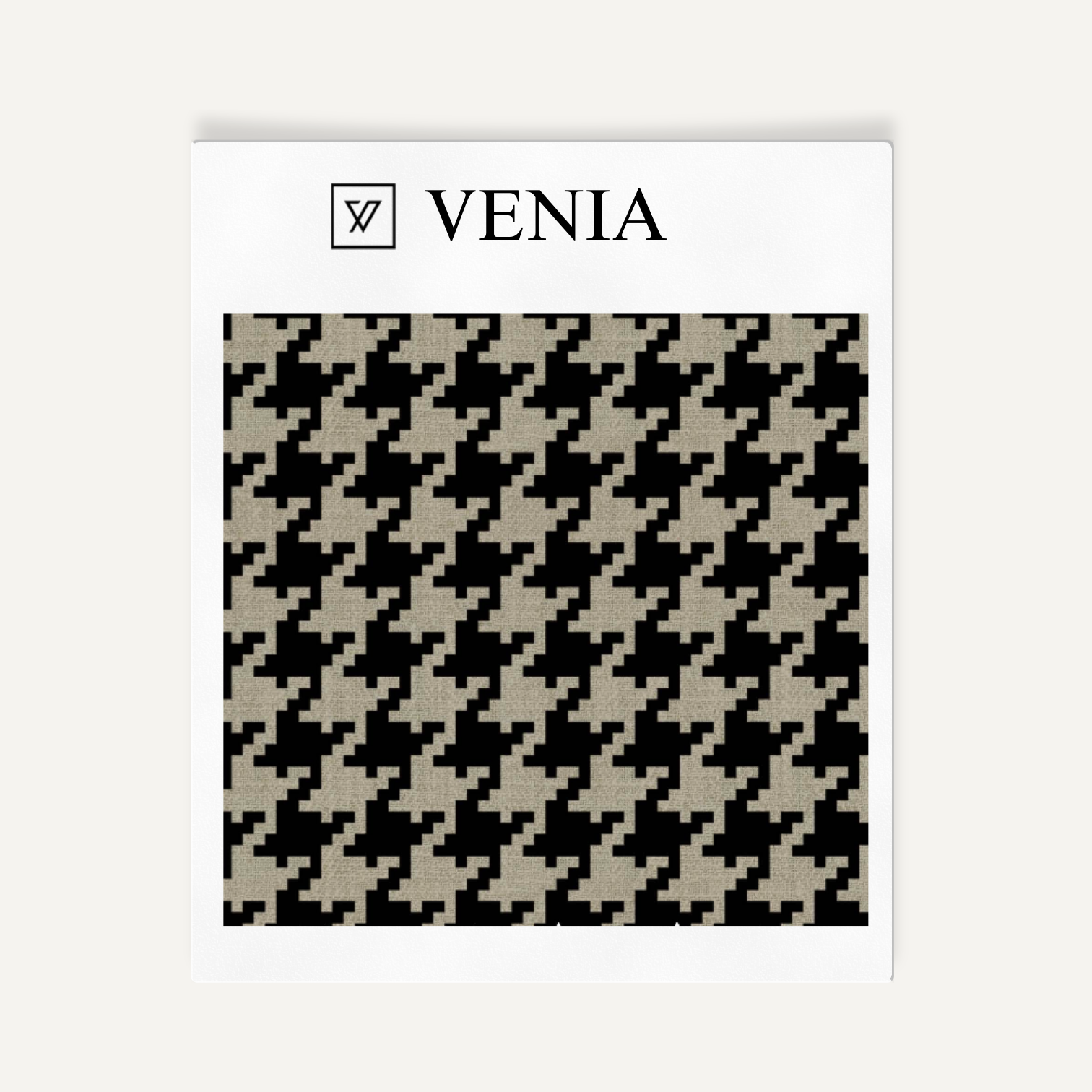 Grand Houndstooth reimagines the traditional houndstooth pattern at a strikingly large scale. The oversized tooth design makes an unmistakable impact, perfect for interiors where the fabric itself becomes the focal point. In bold black-and-ivory contrast, Grand Houndstooth is ideal for feature chairs, dramatic cushions, or statement walls of drapery.