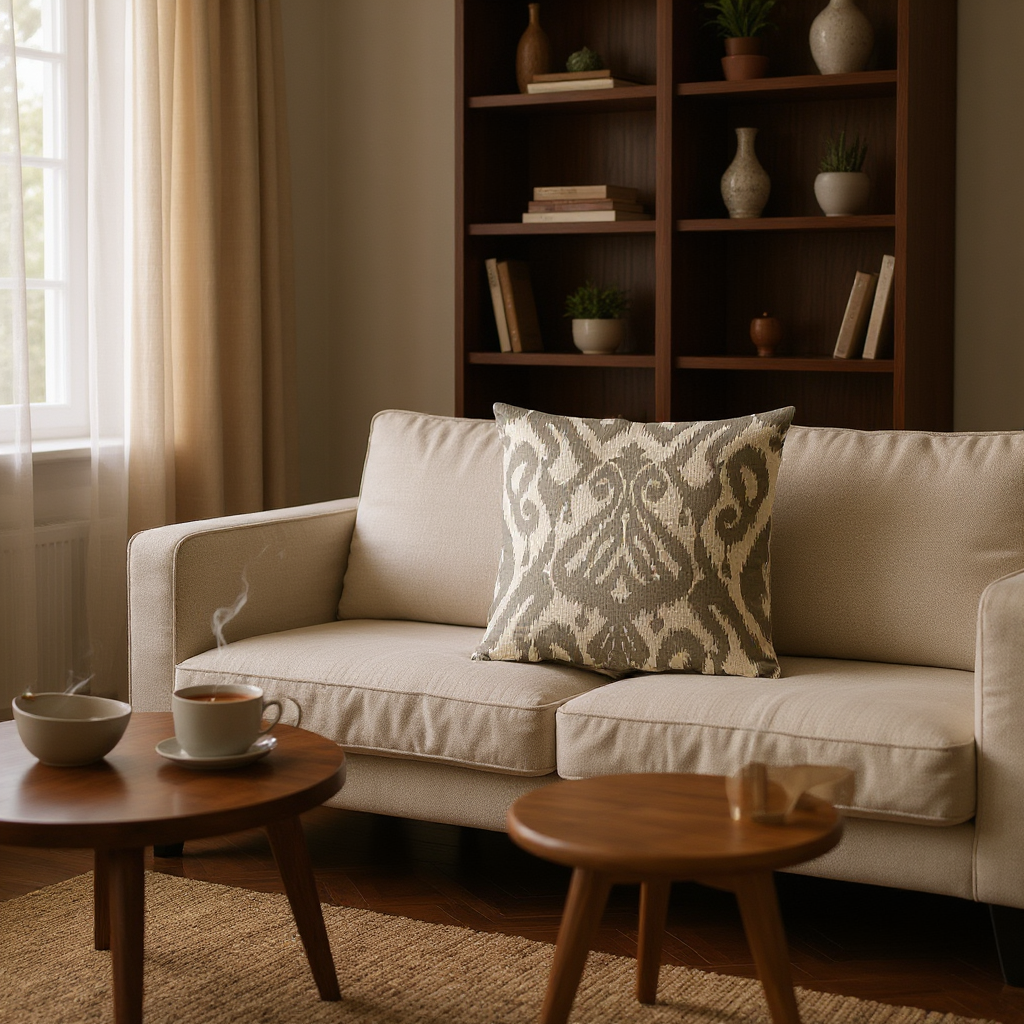 The Ikat Diamond Grey Cushion softens strong geometry with the feathered edges of traditional ikat craft. Its diamond repeats feel both structured and fluid, bringing subtle depth to sofas, chairs, or beds. In earthy neutrals, it works as a versatile accent with a timeless, handcrafted character.