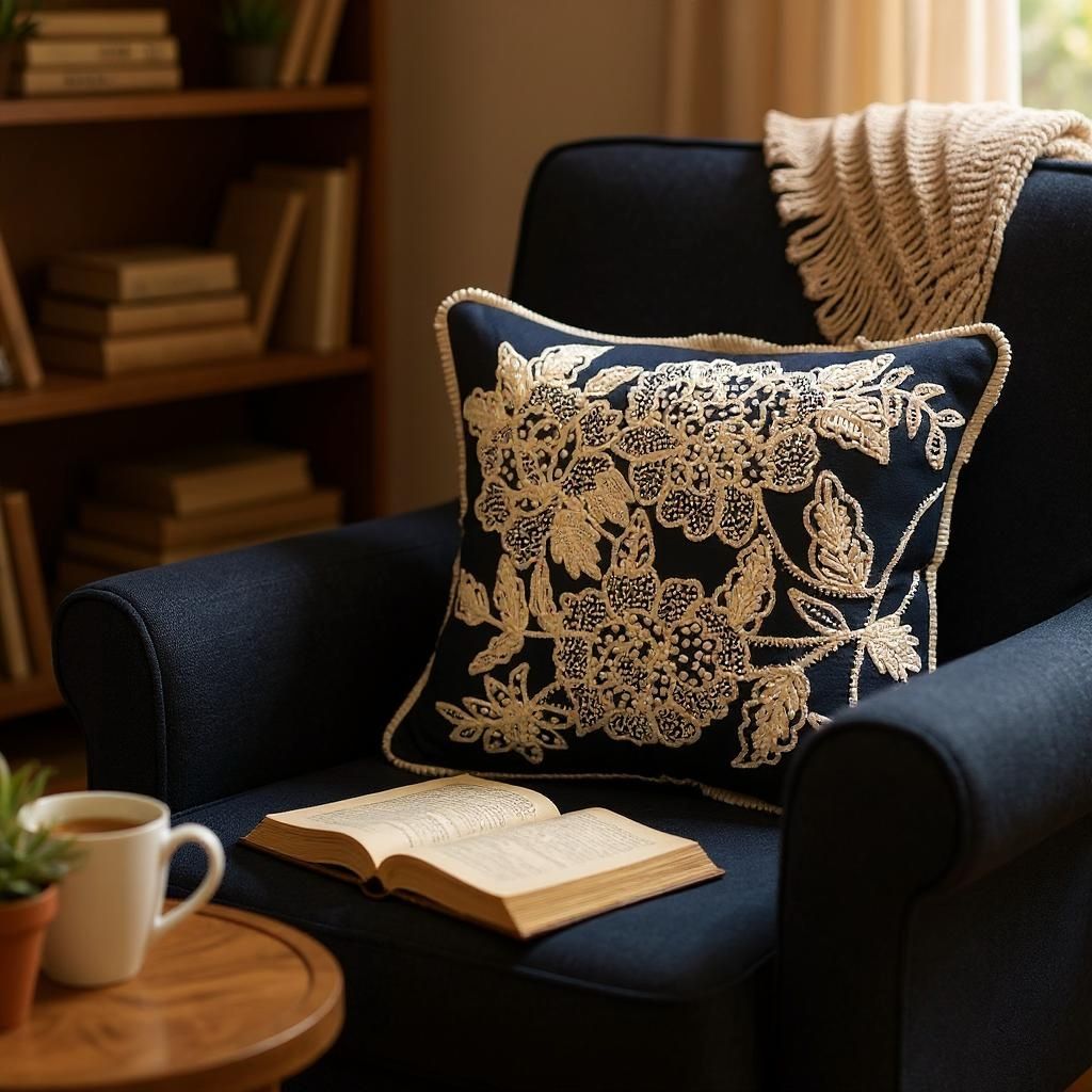 Inkwash Beaded Cushion is a striking navy cushion cover detailed with bold ivory embroidery and soft beaded texture. The cushion makes a quiet yet confident statement— rich in contrast, tactile in feel. Perfect on its own or paired with lighter neutrals, it brings balance, depth, and refined detail to your living space.