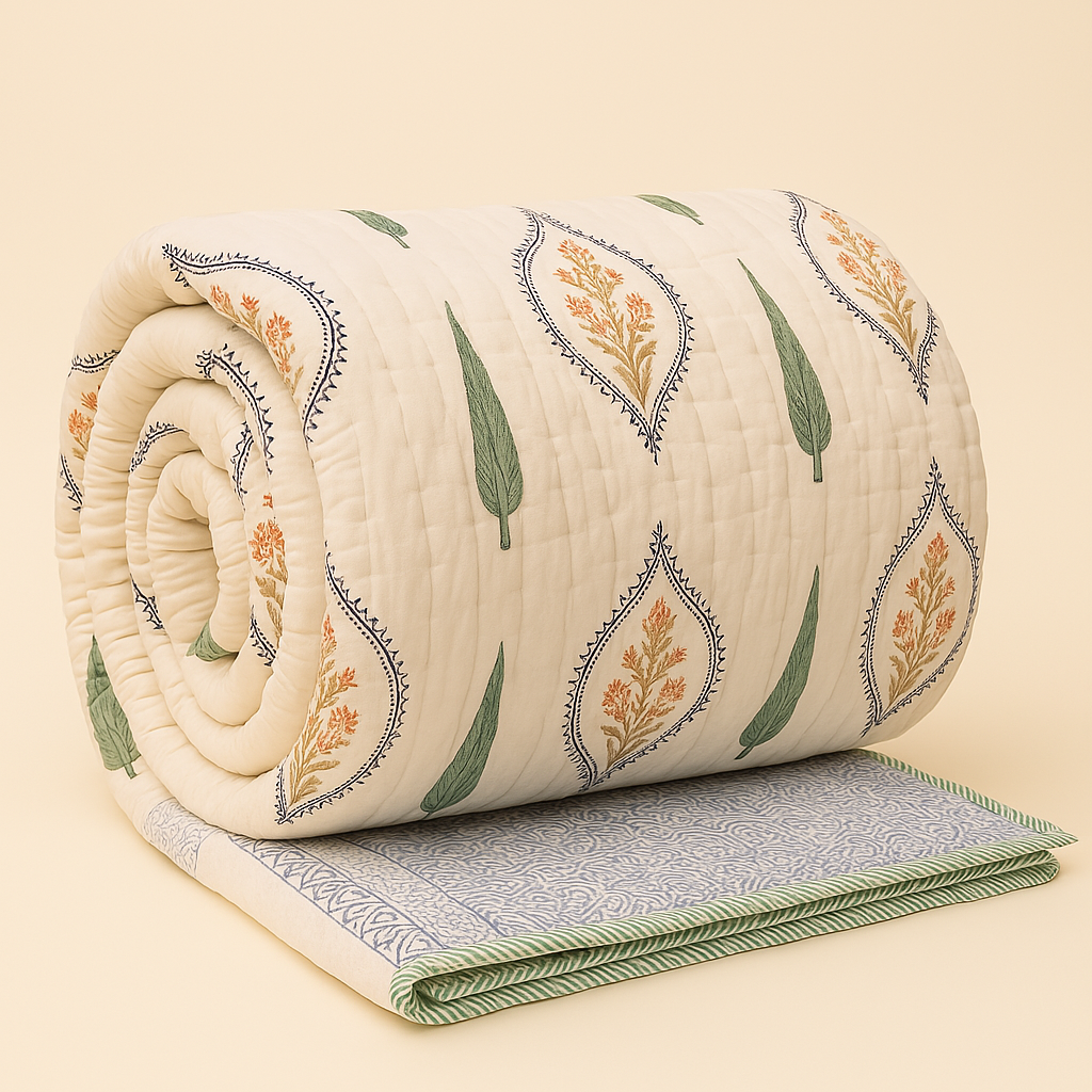 Immerse yourself in the timeless allure of the Leher Block Print Quilt. Showcasing a reversible design with intricate Jaipuri prints, this razai perfectly blends modern aesthetics with heritage charm. Made from soft cotton, the Leher Quilt ensures a cozy and warm embrace, making it a must-have for those seeking beauty and tranquility in their sleep space.