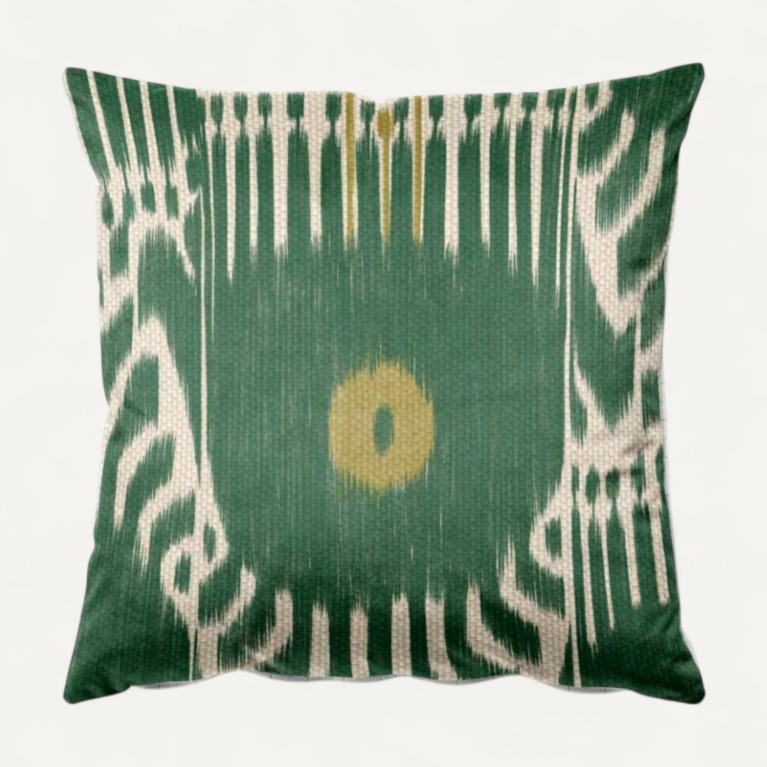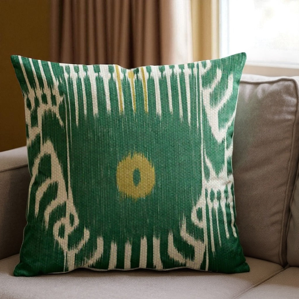 The Mystic Eye Cushion features bold circular medallions with radiating lines, echoing ikat’s handcrafted artistry. Its striking eye-like motif brings depth and drama, making it a standout accent for sofas, chairs, or beds. A perfect blend of heritage craft and modern edge.