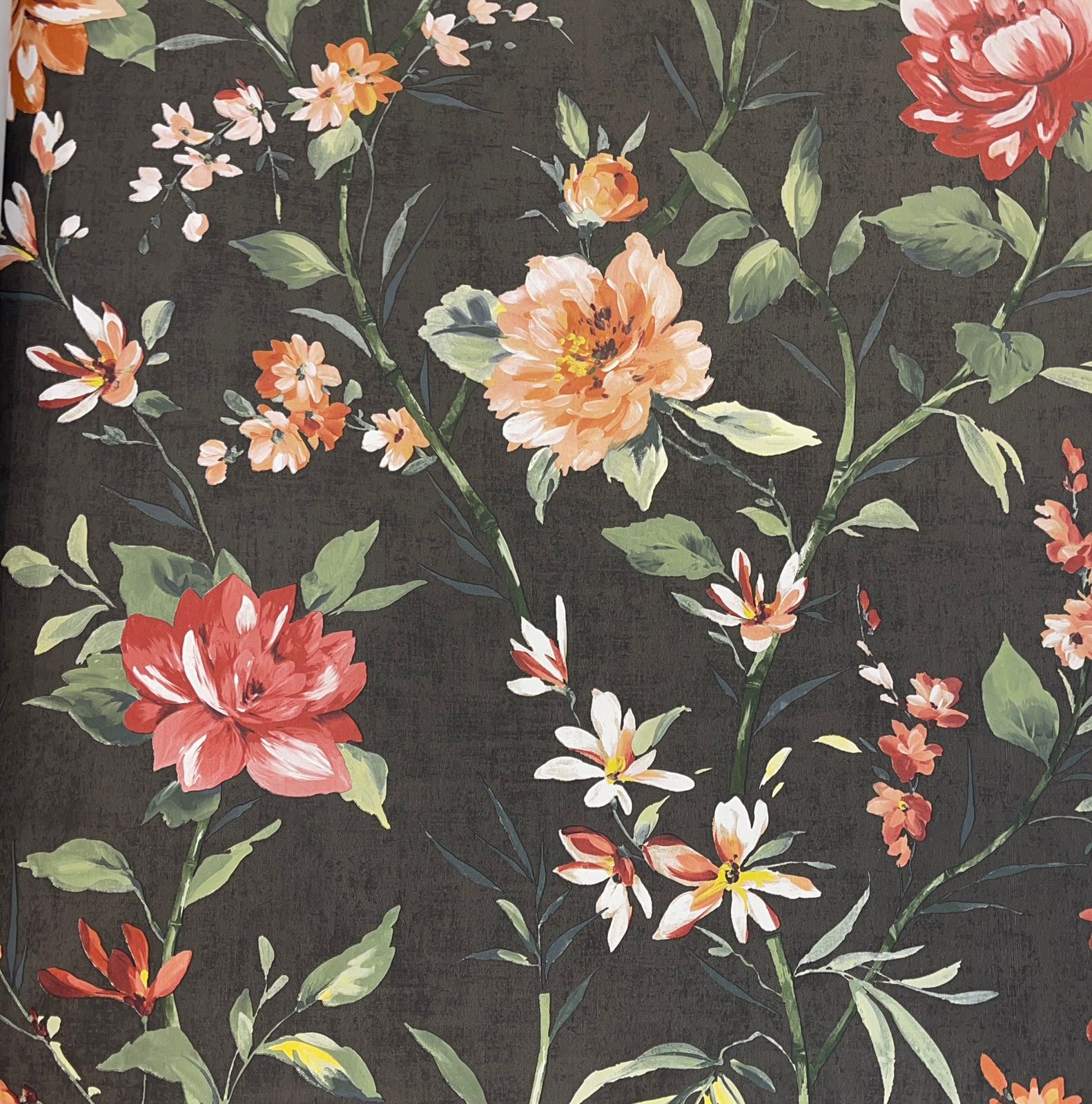 Meadow Muse – Twilight blends moody charcoal tones with luminous florals, giving your walls a romantic, twilight-inspired charm. The painterly blooms in peach, ivory, and gold seem to glow against the deep background.