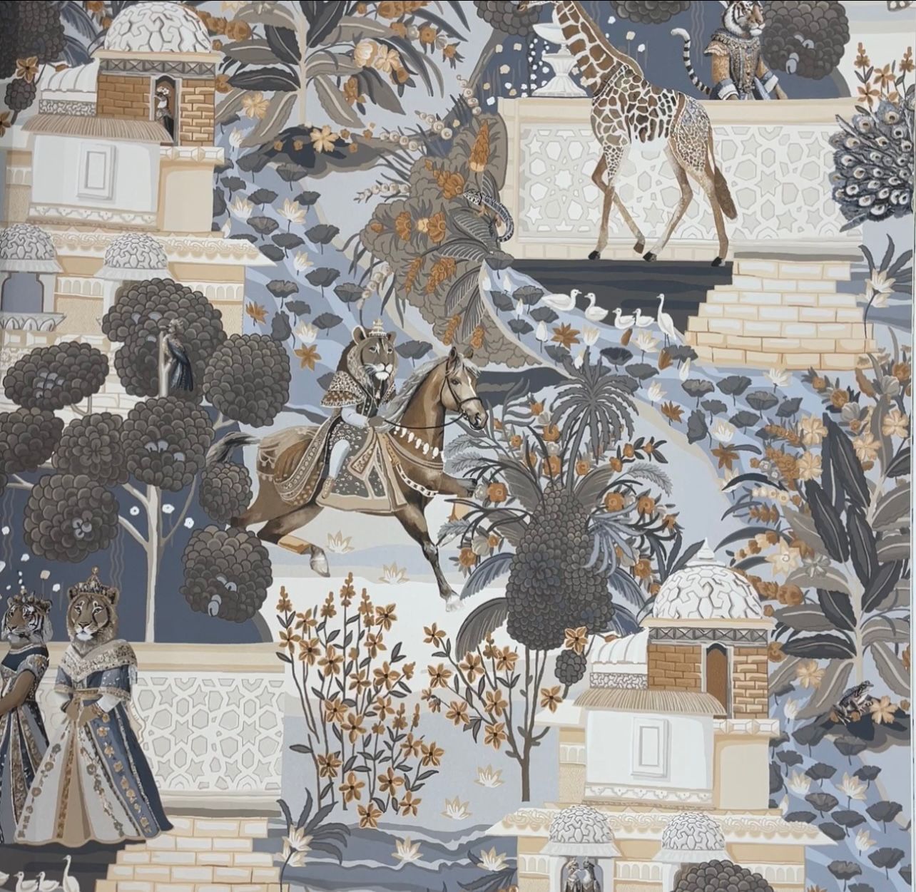 Palace Parade is a work of storytelling on your walls — a majestic procession of animal royalty moving through palace courtyards and lush gardens. Rich in detail and layered in warm ochres, cool blues, and earthy neutrals, it captures the intrigue of a royal safari meeting the elegance of classical architecture. Pair with antique brass accents, velvet upholstery, and deep wood furniture to create a sumptuous, heritage-inspired interior.