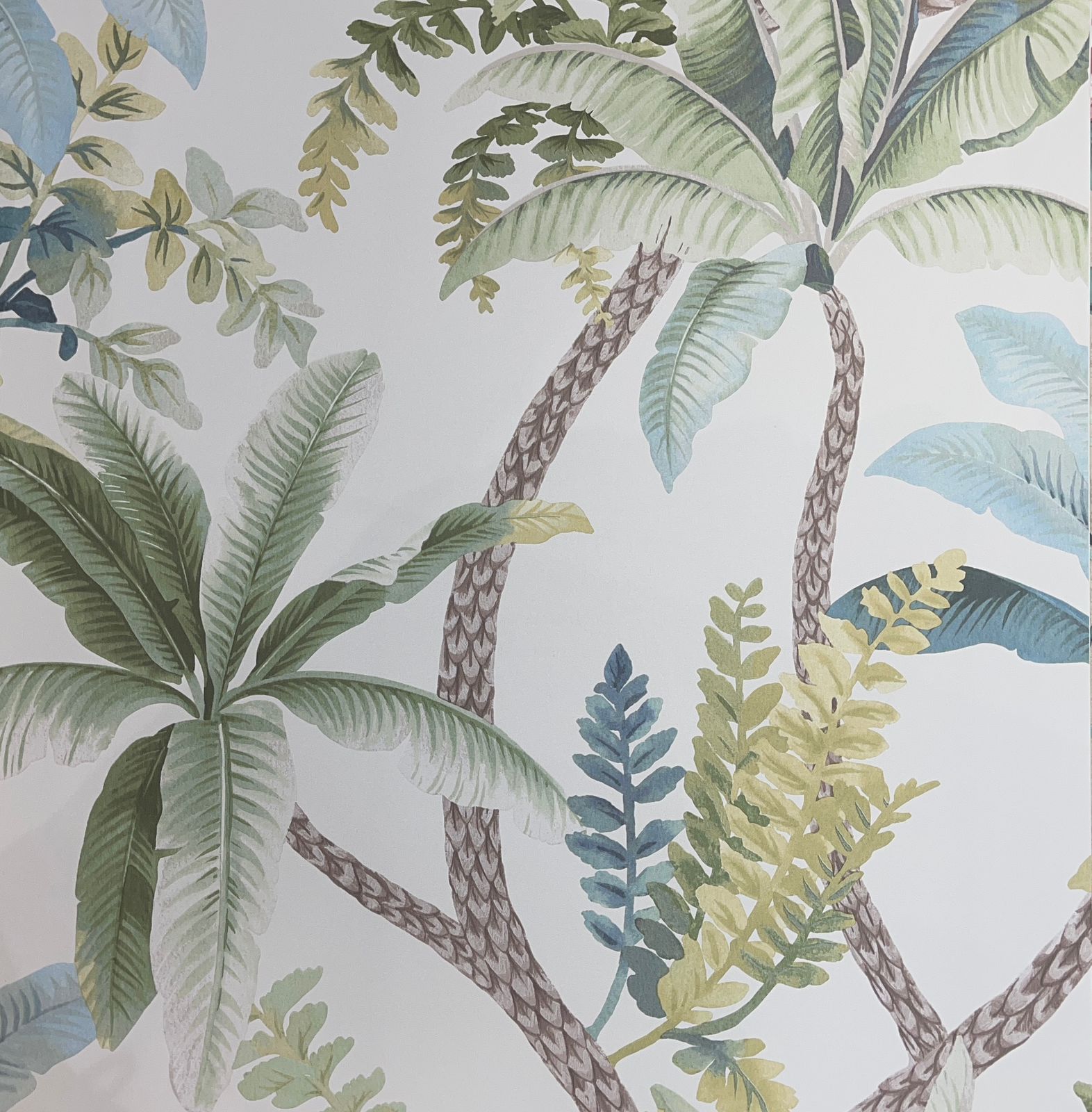 An airy take on tropical living, this wallpaper showcases lush palms and layered foliage in greens, blues, and golds against a fresh white backdrop. Ideal for beach homes, breezy bedrooms, or sunlit lounges.