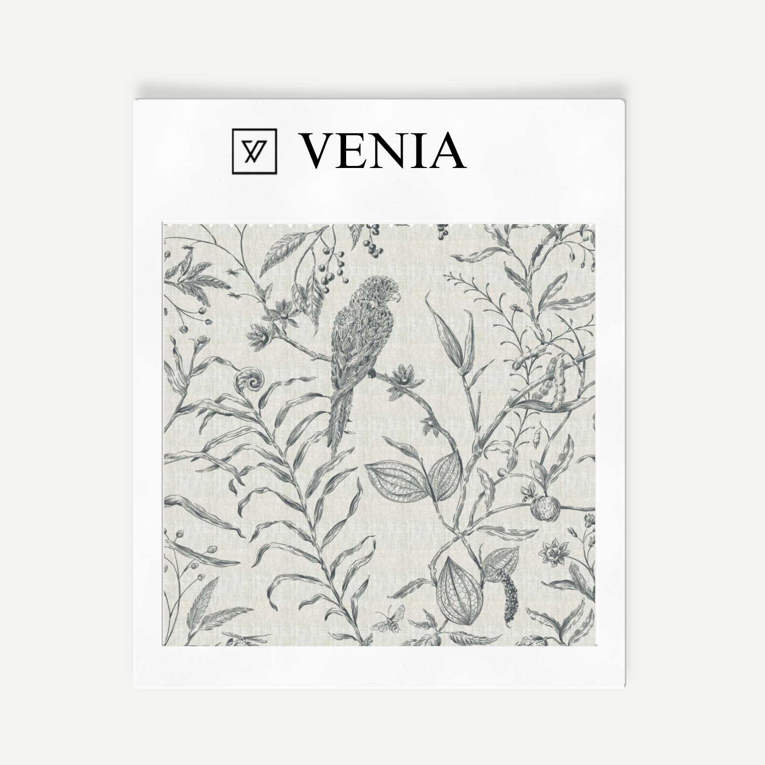 Featuring finely detailed illustrations of perched birds, lush foliage, and exotic fruits, this timeless design is inspired by classic botanical Toile prints.