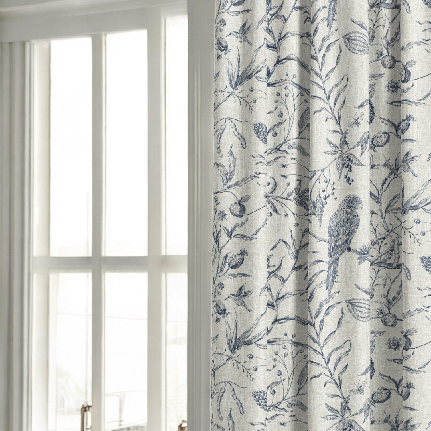 Featuring finely detailed illustrations of perched birds, lush foliage, and exotic fruits, this timeless design is inspired by classic botanical Toile prints.