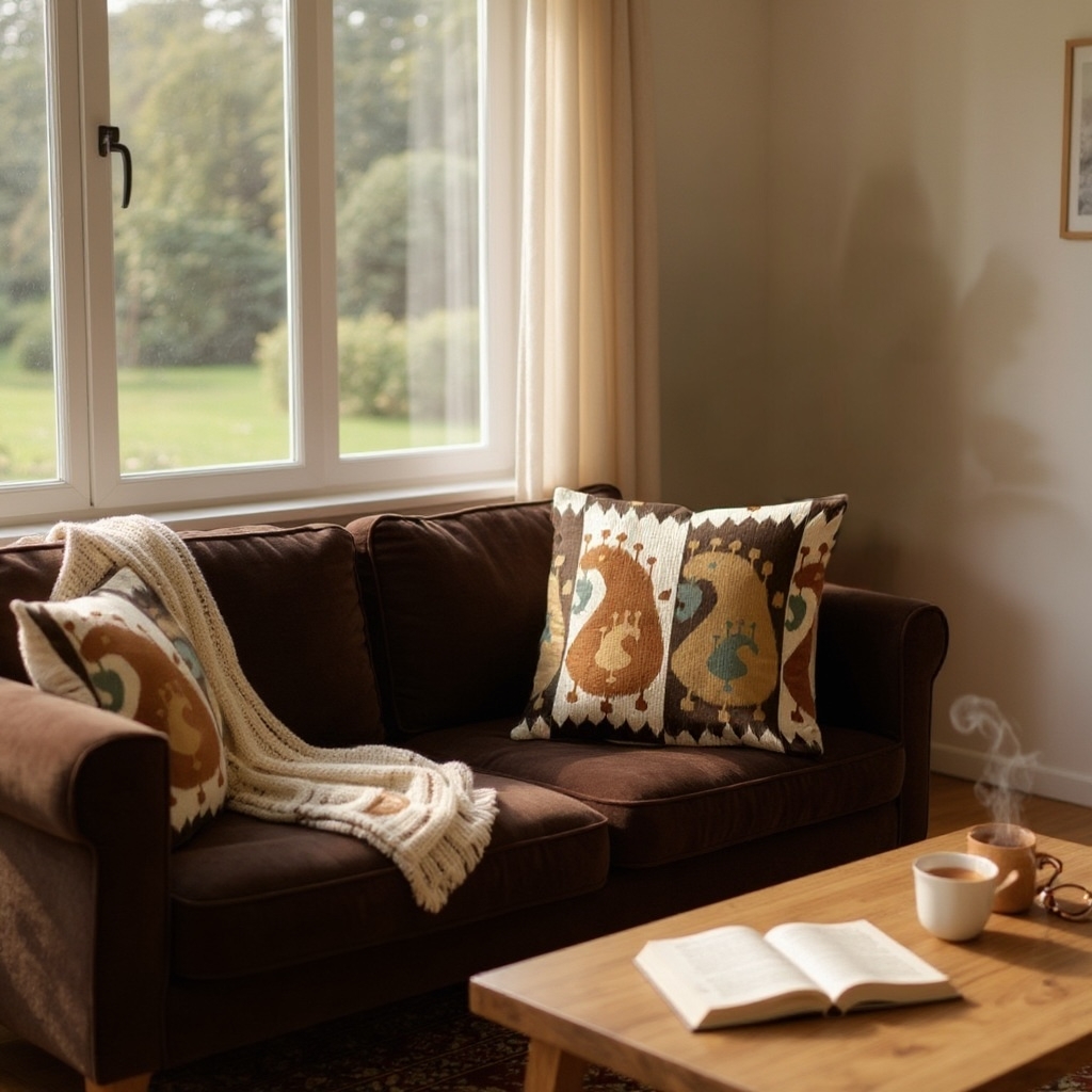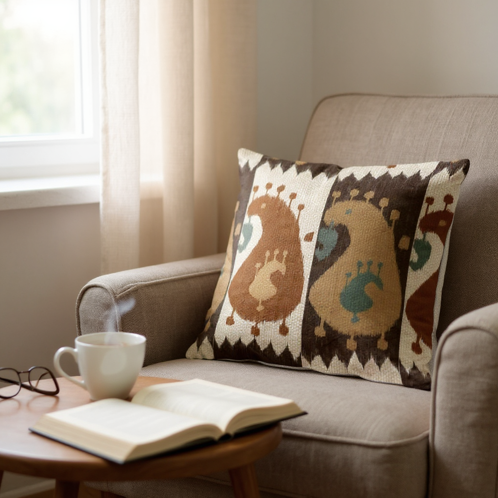 The Playful Paisley Cushion brings a heritage motif into a softer, modern light. Its curved, almond-like forms feel familiar yet fresh, with a lighter palette that adds charm and ease. A versatile accent for sofas, chairs, or beds, it balances tradition with a contemporary mood.