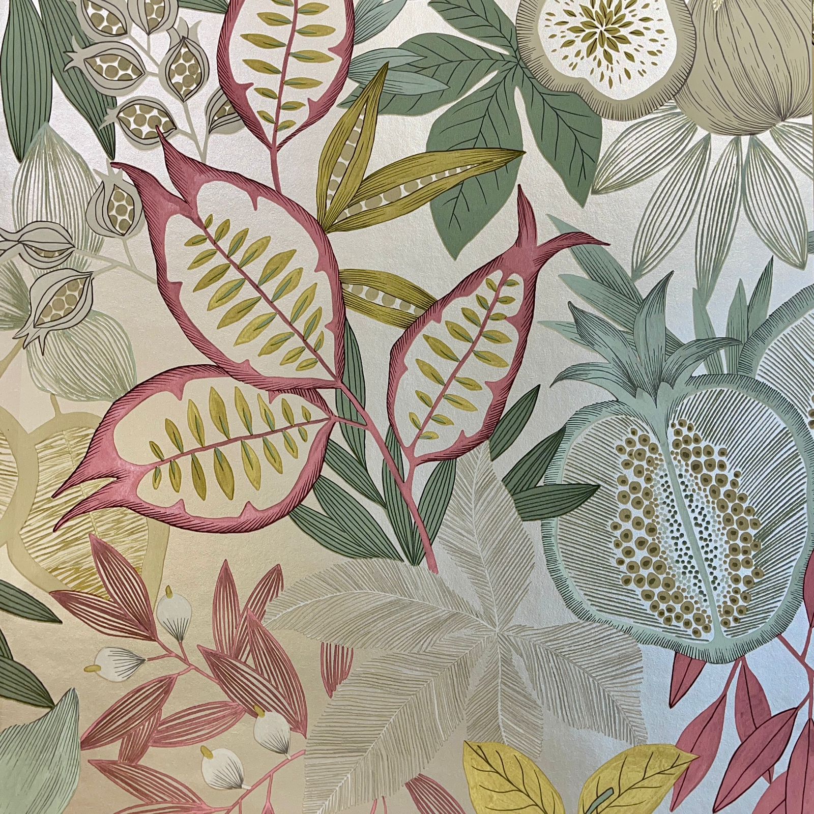 A statement botanical print featuring pomegranates, leaves, and floral details in soft pinks, sage greens, and muted golds. This wallpaper captures the richness of nature with a sophisticated palette and intricate detailing, adding warmth and elegance to your interiors.