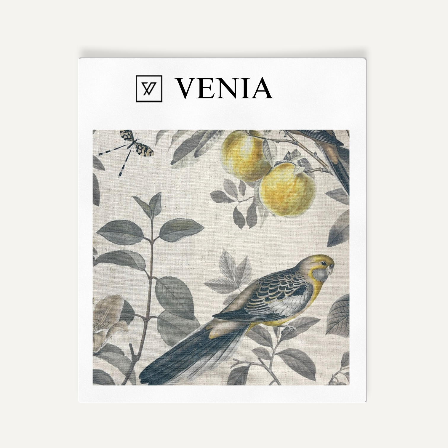 Pomona’s Garden glows with the warmth of golden harvests. Fruit and avian motifs intertwine in a lively yet refined composition, ideal for uplifting upholstery or radiant drapery.