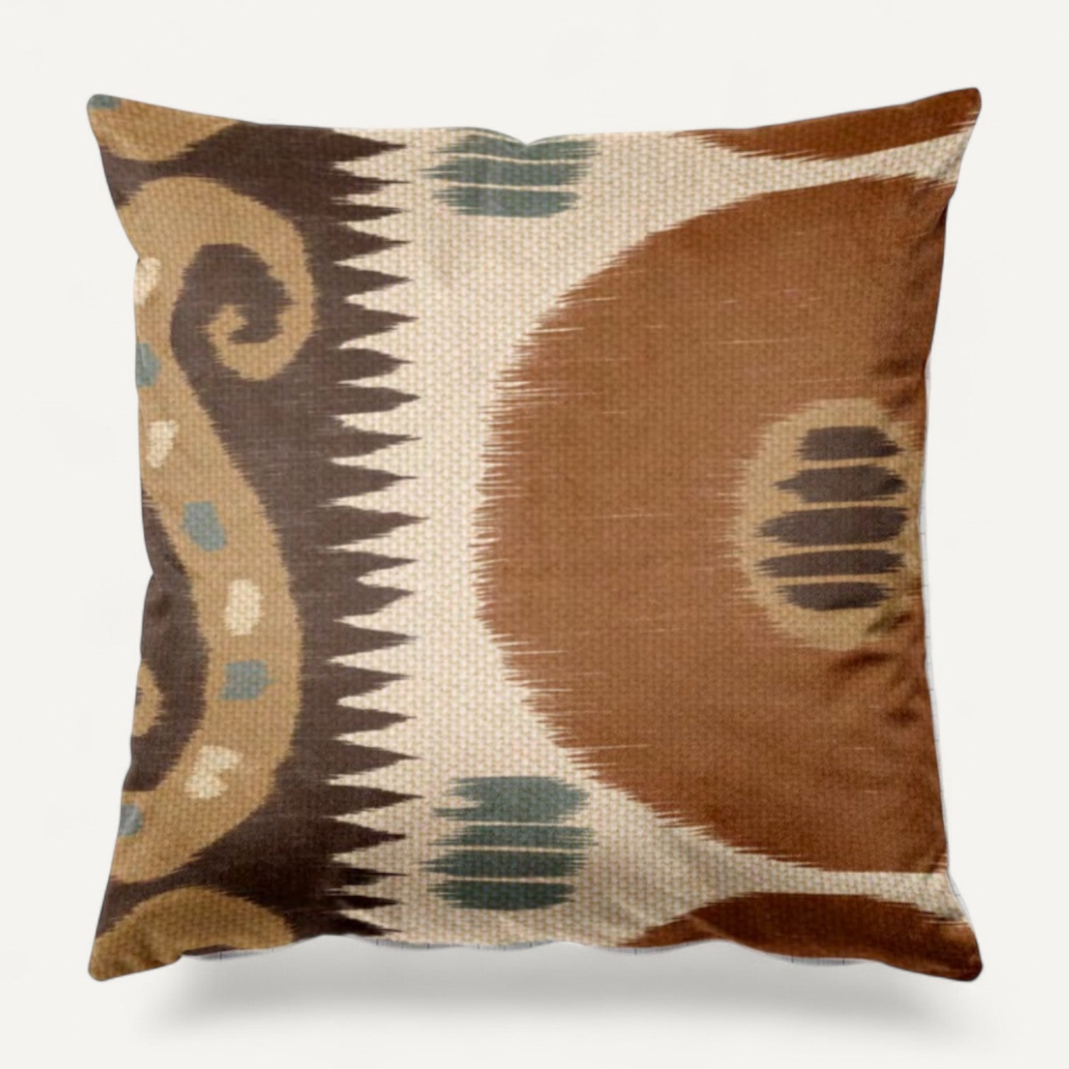 The Solara cushion features bold ikat artistry in warm earthy browns, accented with soft teal and cream. Circular medallion forms meet flowing scrolls, creating a striking balance of geometry and organic movement. A rich accent for sofas, chairs, or beds, it brings both heritage depth and modern ease.