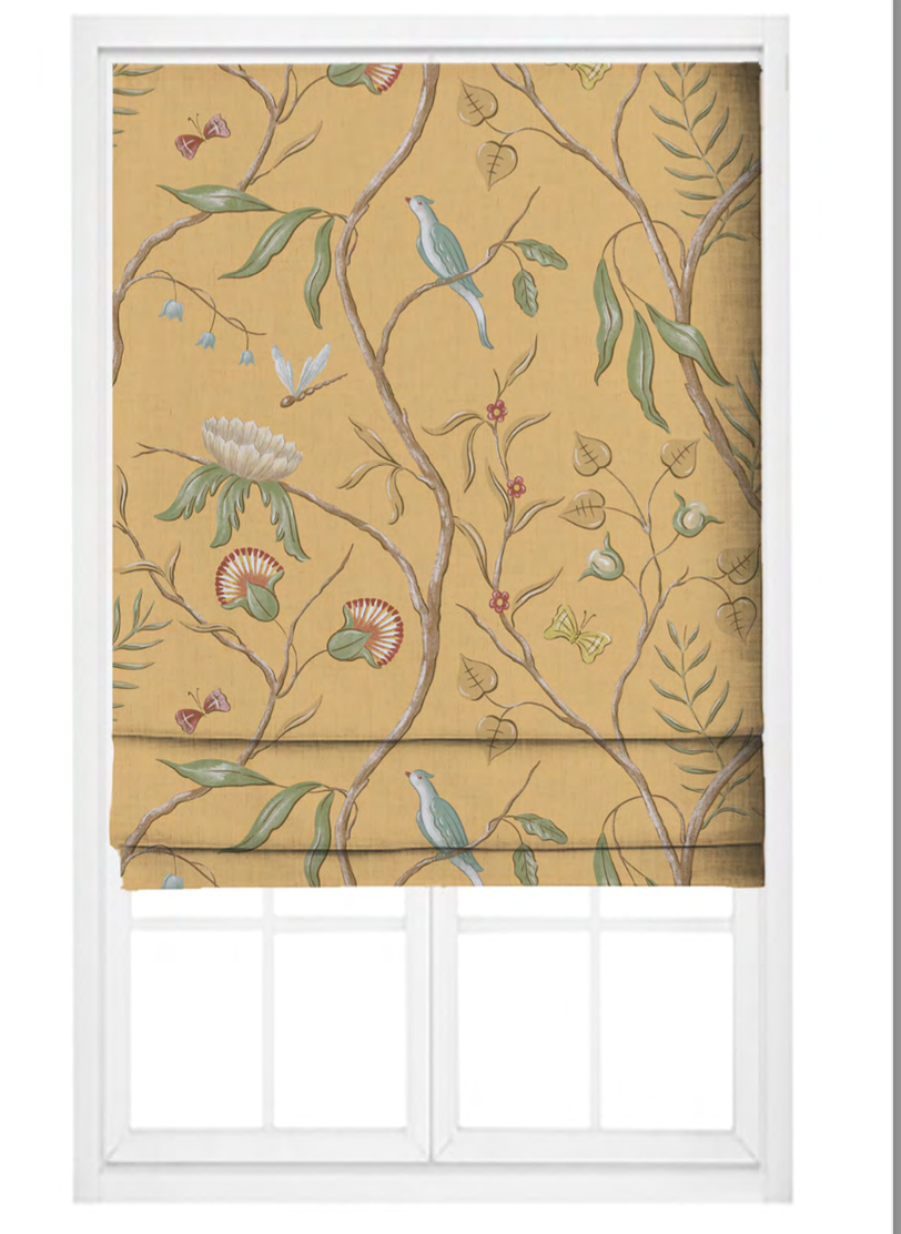 Songbird Trail depicts perched birds on branches with painterly leaves and blossoms. Evocative of garden scenes, this fabric adds whimsy and elegance at once, ideal for feature drapes, blinds, and relaxed upholstery.