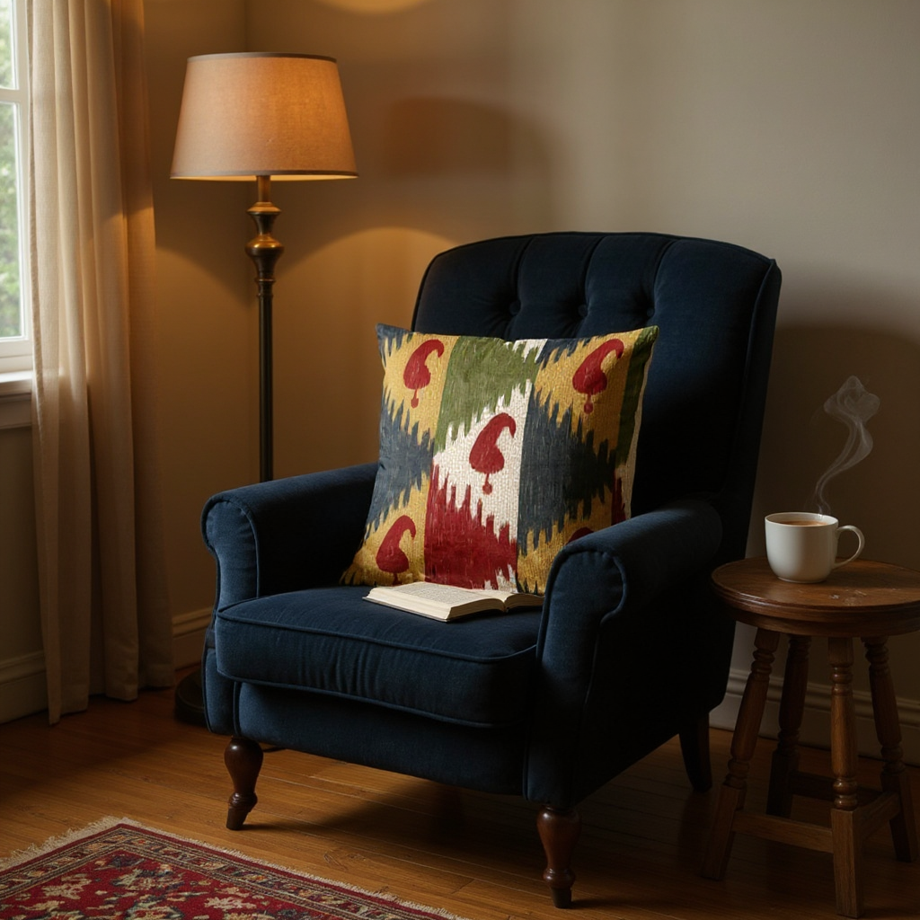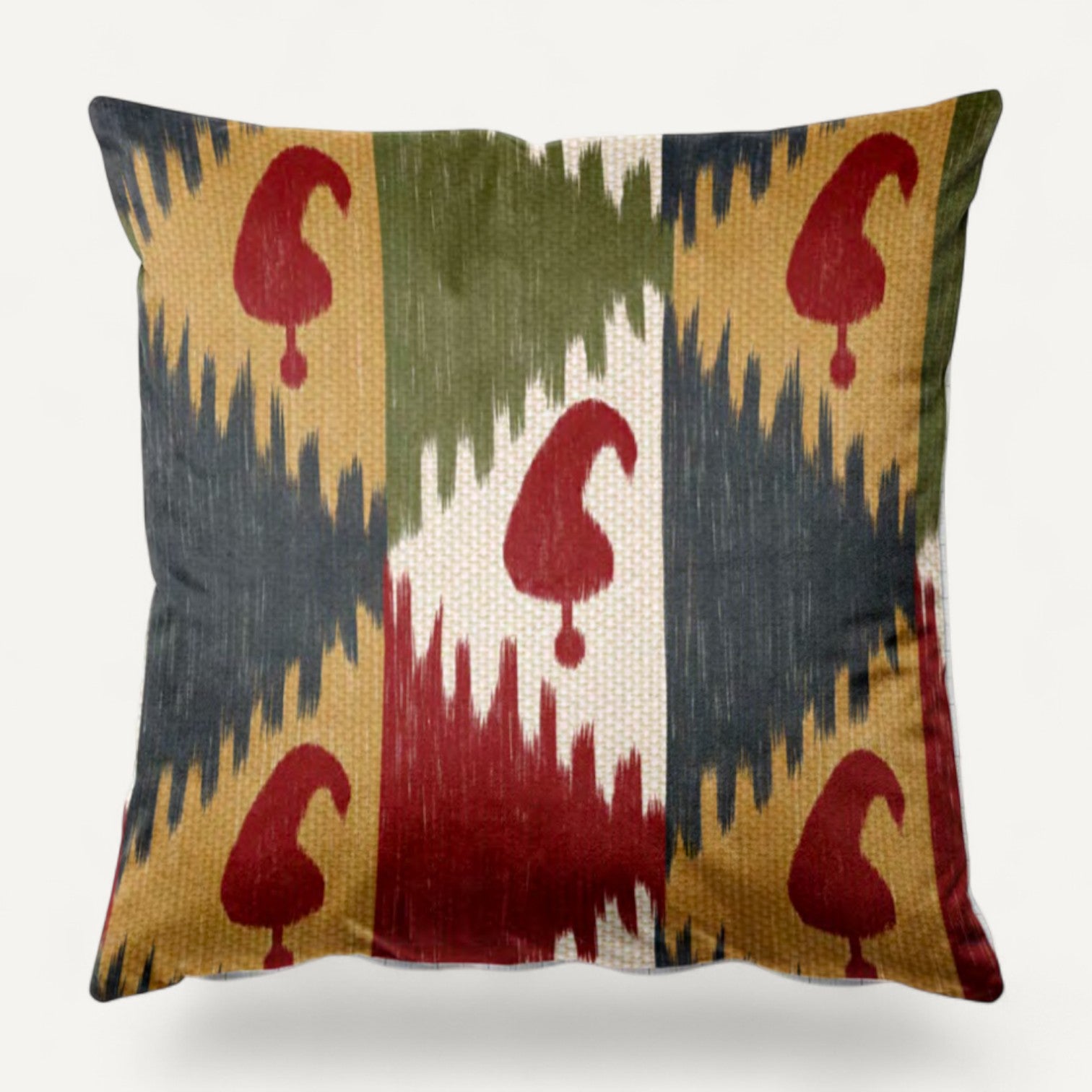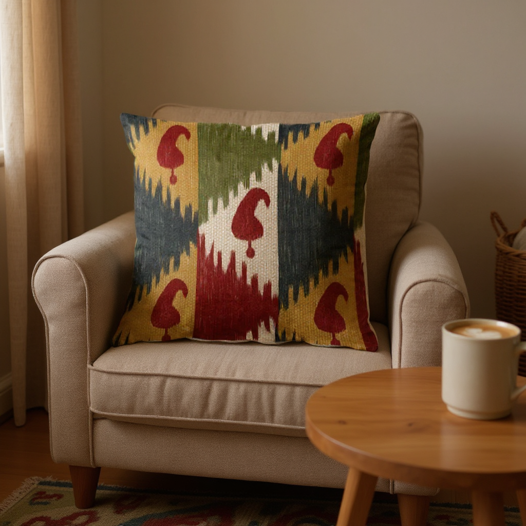 The Sprout Cushion brings heritage weaving to life with upward, curved motifs softened by ikat edges. Its organic flow and vibrant tones create a lively accent, perfect for sofas, chairs, or beds that call for color and movement.