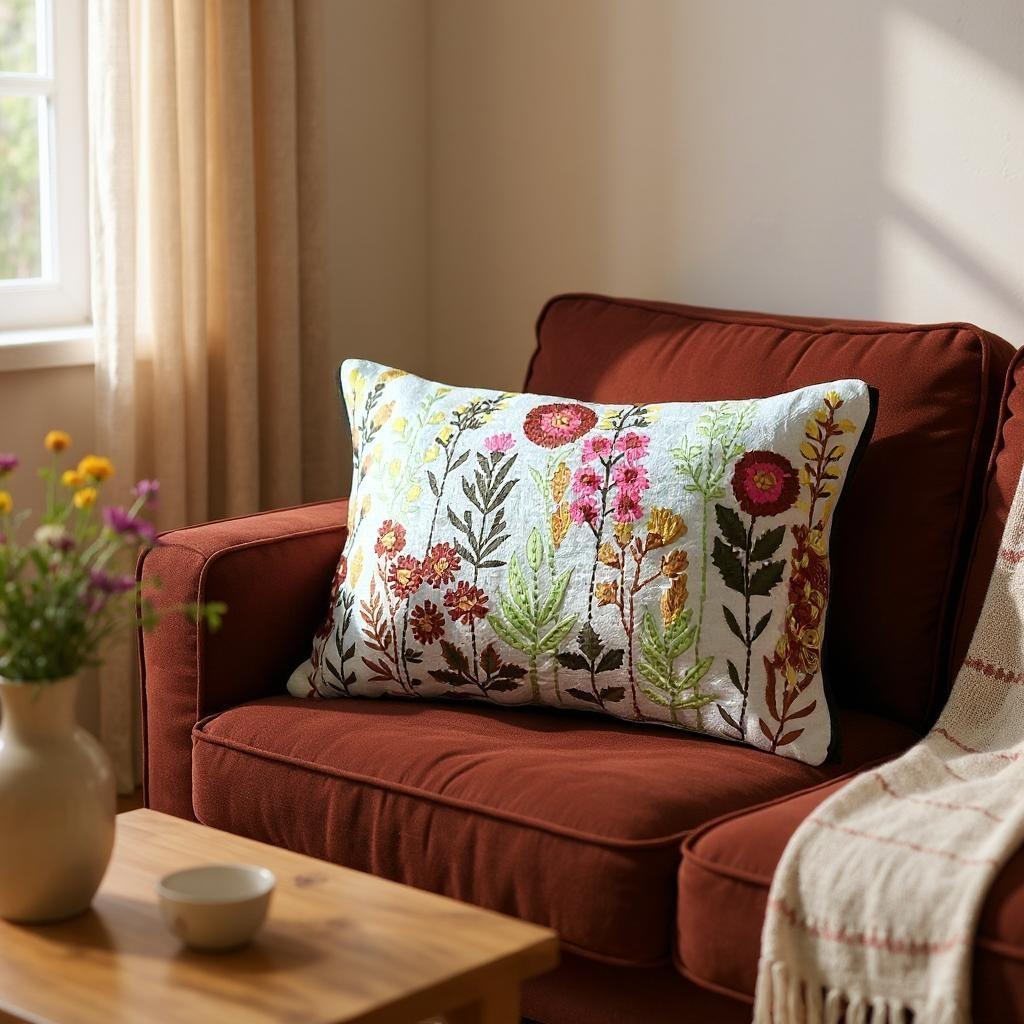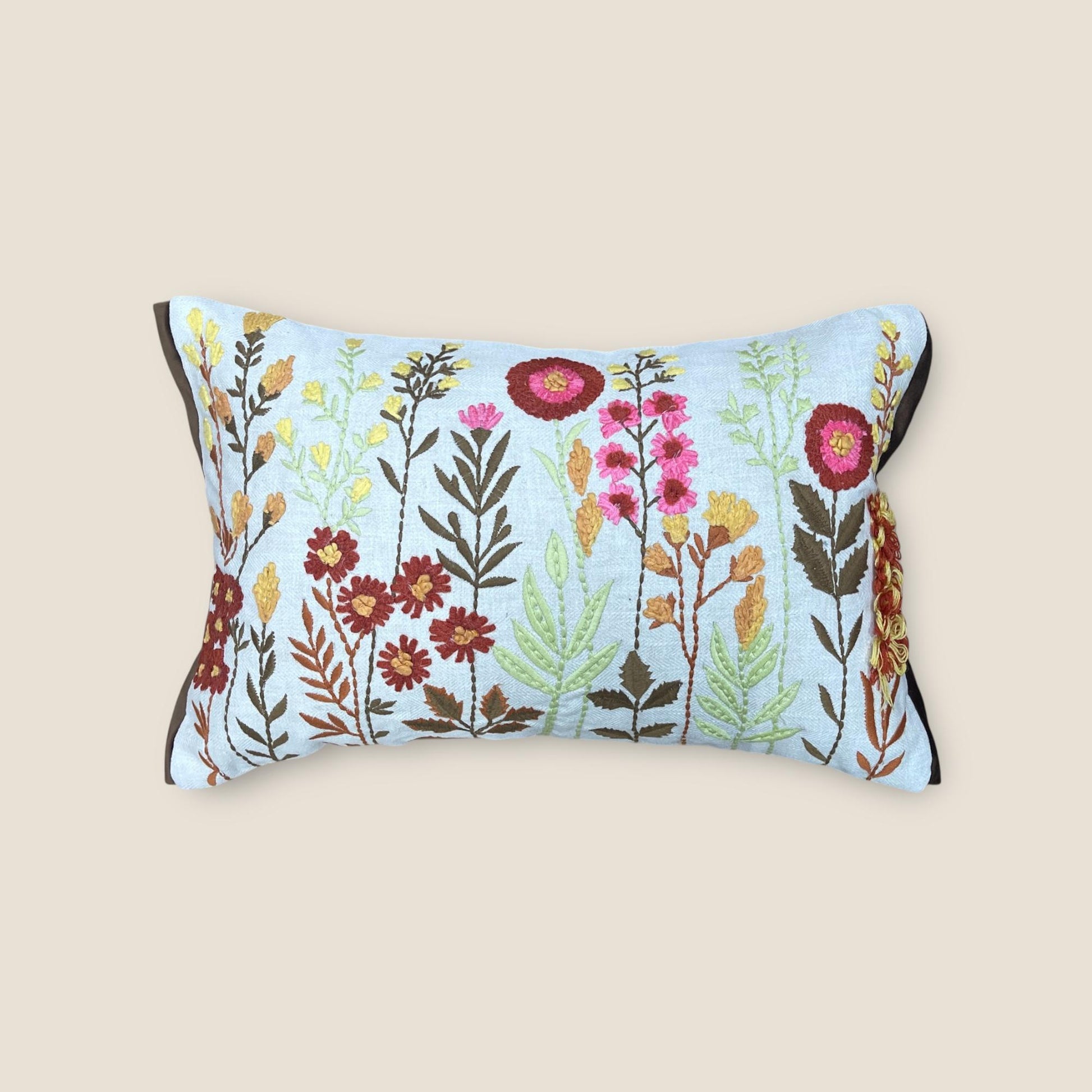 Thoughtfully designed with a balance of texture and structure, Trim & Thread features intricate thread embroidery on a soft cotton-blend base, finished with plush velvet piping along two sides. Its size 12x18 makes it ideal for layering - adding depth, craft, and quiet luxury to beds, sofas, or accent chairs.