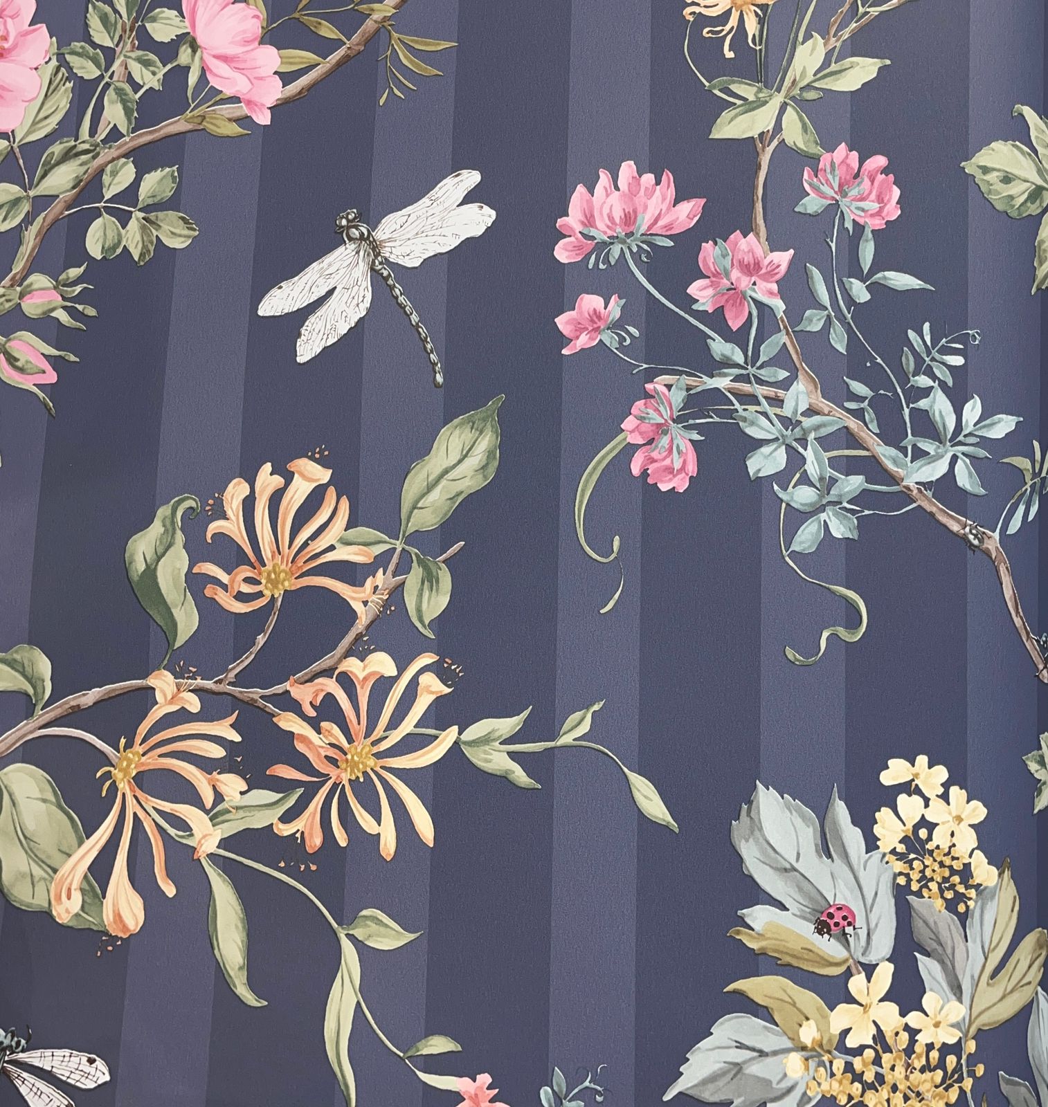Twilight Botanica layers dusky stripes with bursts of blush, coral, and gold florals for a romantic yet modern statement. Style Tip: Pair with deep-toned furniture and metallic lighting for instant drama.