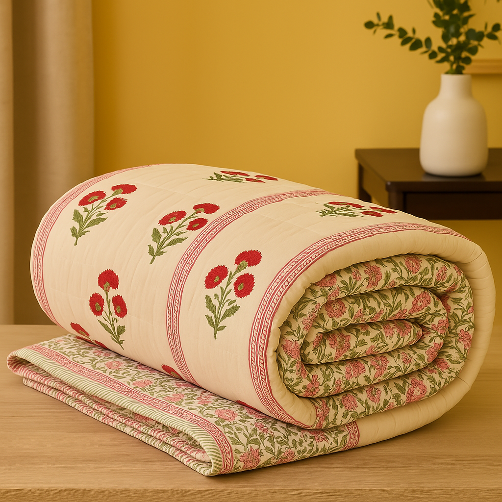 Immerse yourself in the timeless allure of the Udaan Cotton Jaipuri Quilt. Featuring a reversible design with intricate Jaipuri prints, this razai offers a perfect blend of comfort and sophistication. Crafted from soft cotton, the Udaan Quilt ensures a cozy and warm embrace, making it a must-have for those seeking both beauty and serenity in their sleep space.