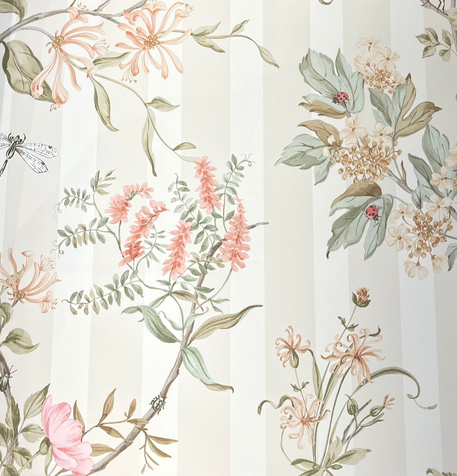 Wisteria Waltz – Coral brings warm coral blooms and soft green leaves to the striped botanical design, offering a fresh take on a classic. Pair with natural rattan and soft blush accents for a sun-warmed look.